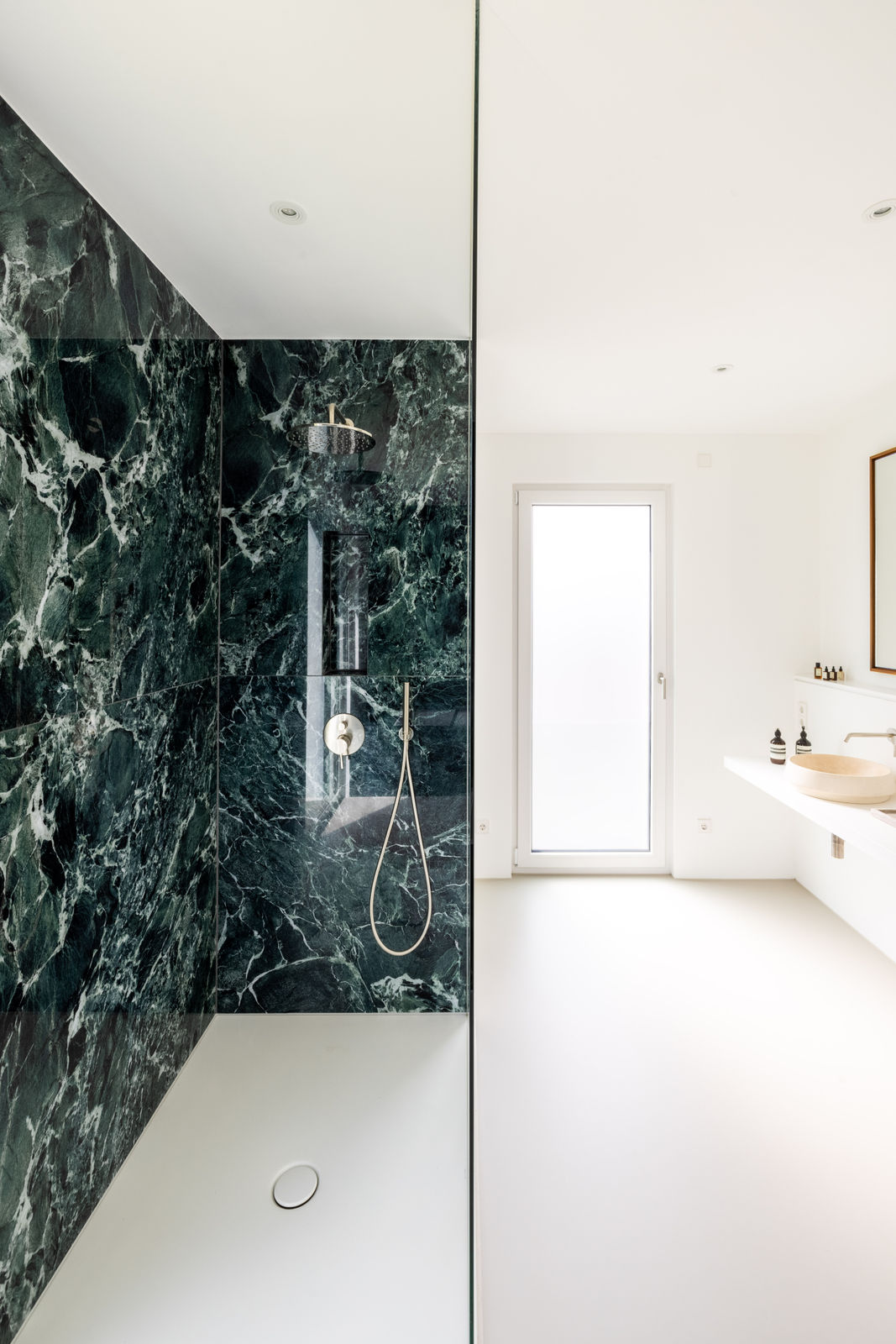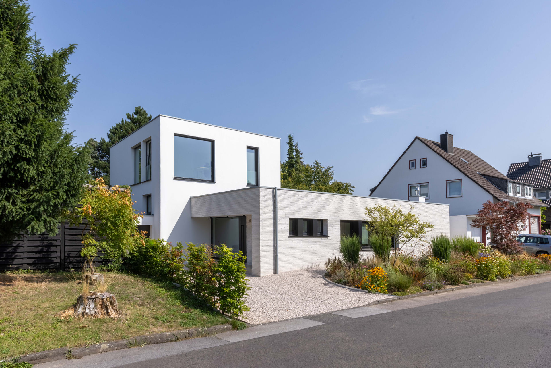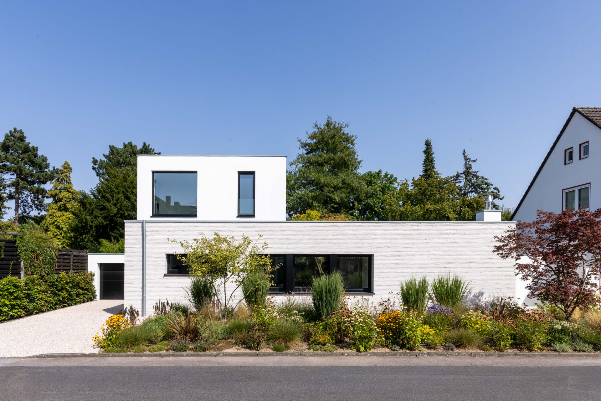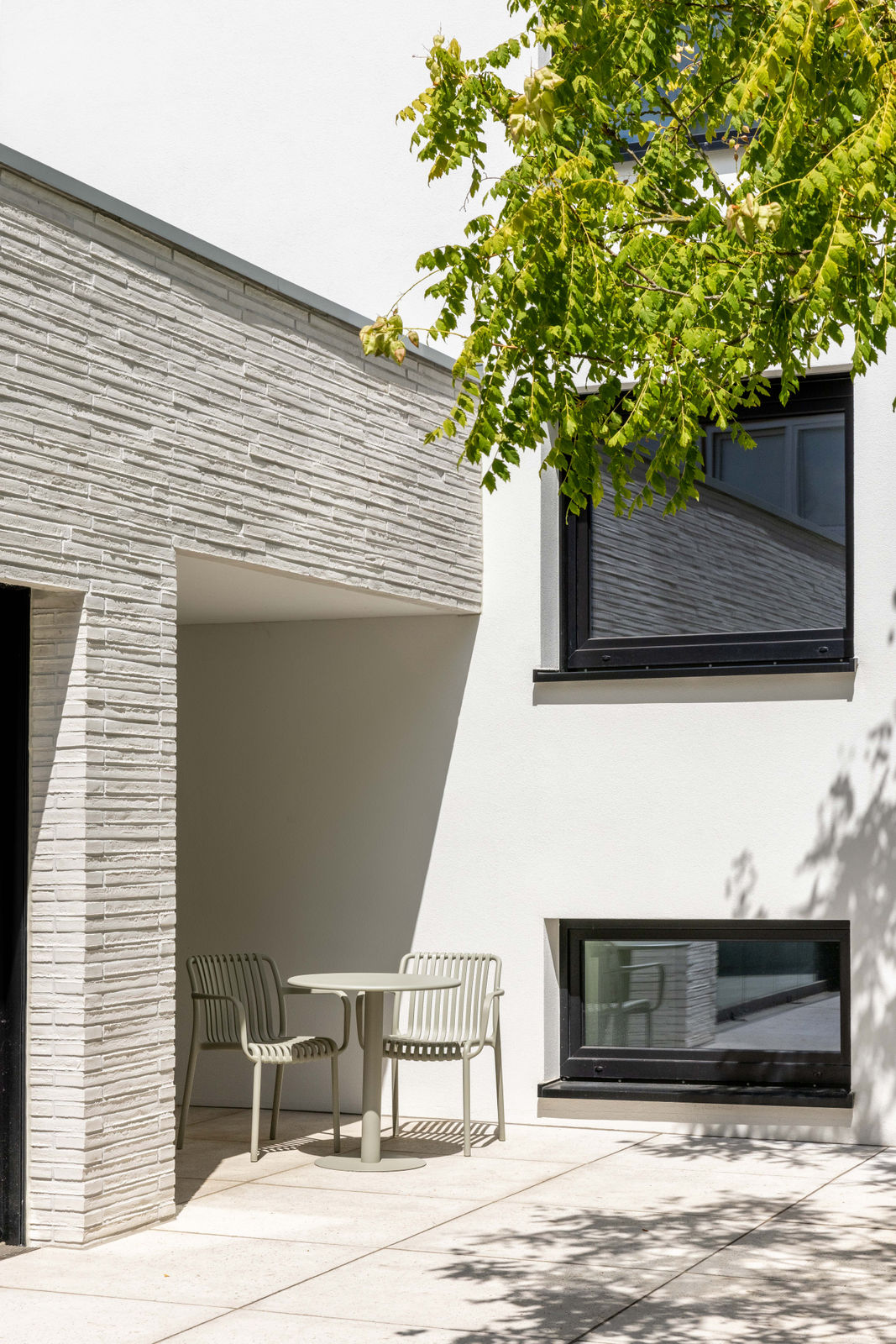 Die Fassade spielt dabei eine zentrale Rolle: Der helle Klinker verleiht dem Haus eine neue Wertigkeit und Tiefe. Er verbindet Bestand und Erweiterung zu einer Einheit, während die dunklen Fensterrahmen markante Akzente setzen. Licht und Schatten treten in Dialog mit der klaren Geometrie und lassen das Gebäude je nach Tageszeit unterschiedlich wirken.